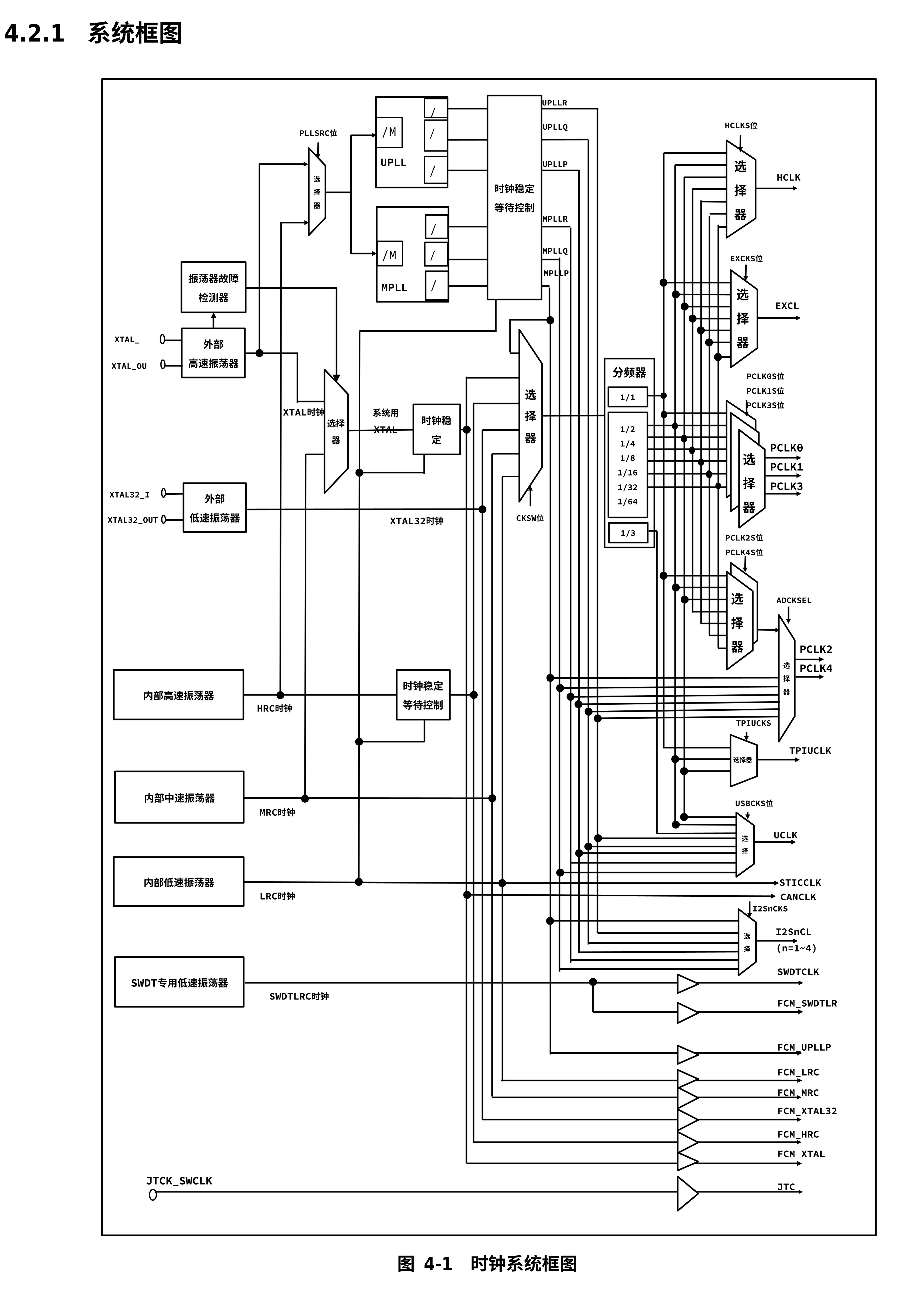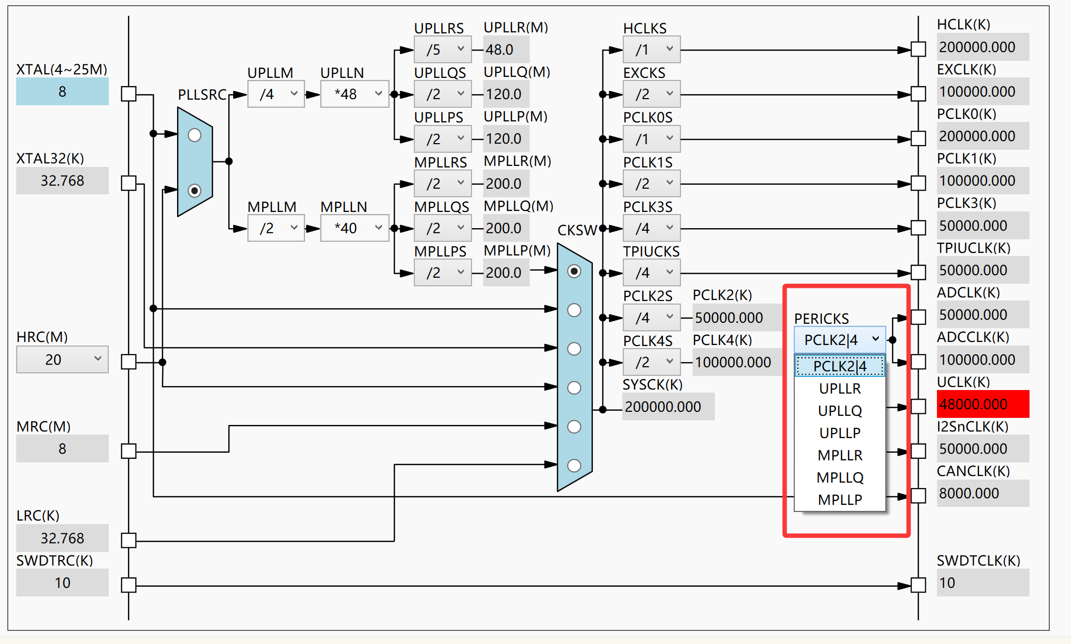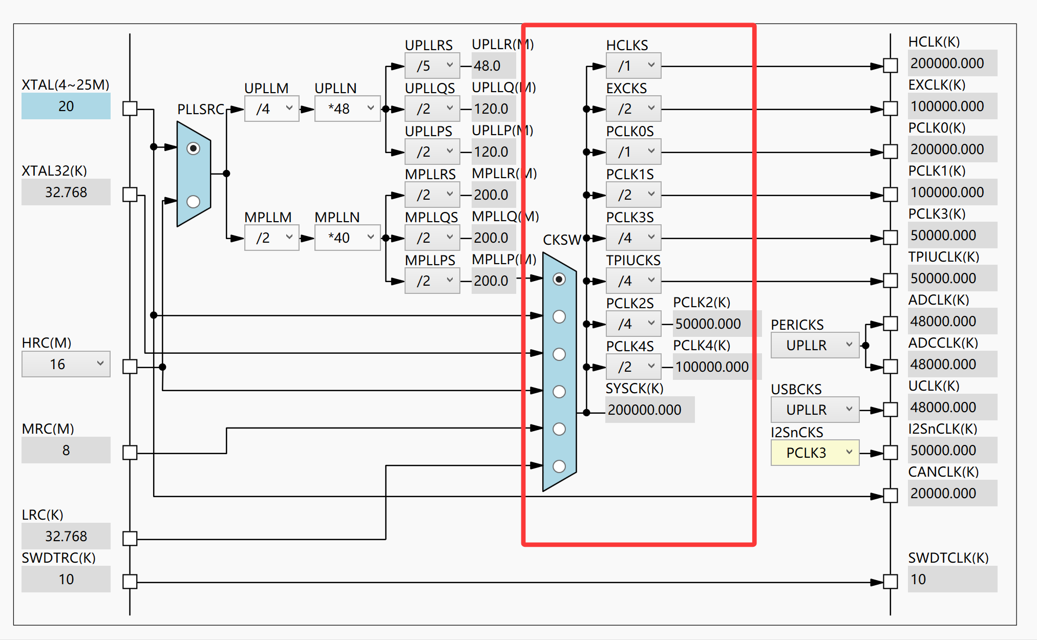 外部XTAL,XTAL32以及内部的HRC,MRC,LRC这些低速时钟无需特别关心,因为它们基本上都是固定的值,没啥好讲的。