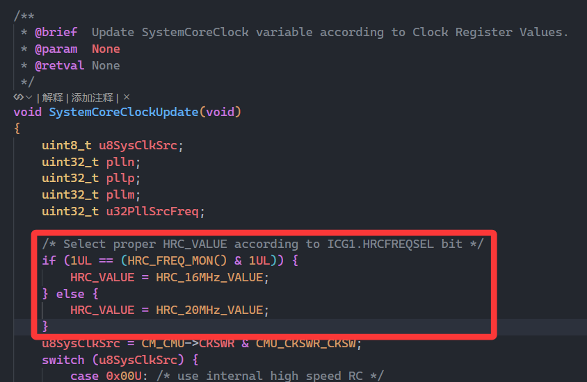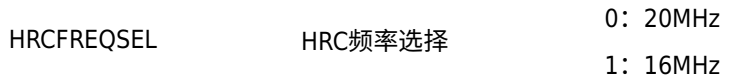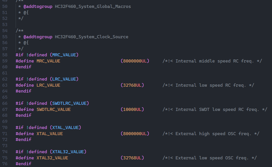 如果使用GCC进行开发的话,HRC这里会有一点小坑,它有两个频率16M和20M可以选择。如果代码是用20M的频率去配置一般是没有问题的,但是如果使用16M就会出现时钟初始化失败的情况。根本原因就在于HC32官方选择了一种很扭捏的方式配置HRC_VALUE的值,导致选择16M时实际代码里面是按20M在计算。从上面的图可以看到,HRC_VALUE并没有和MRC_VALUE,LRC_VALUE写在一起。