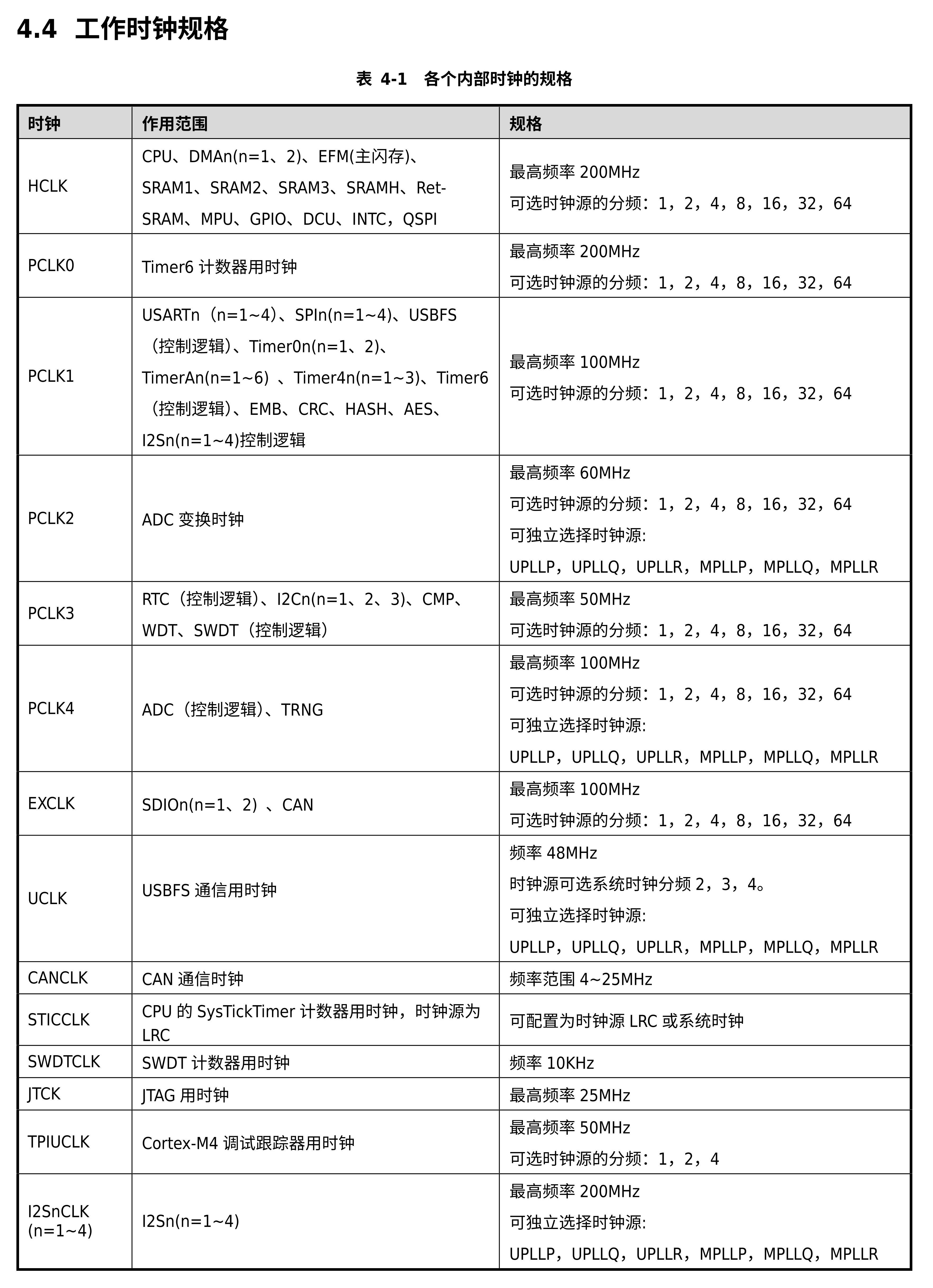 系统时钟经过分频后又生成8个时钟:HCLK,PCLK0,PCLK1,PCLK2,PCLK3,PCLK4,EXCLK,TPIUCLK。各自的作用在手册中有详细说明,如下:
