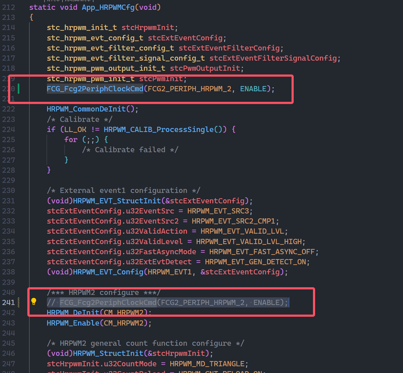 在XHCode V1.10.0中,为HC32F334生成的配置HRPWM的代码中开启外设时钟函数的位置有问题。