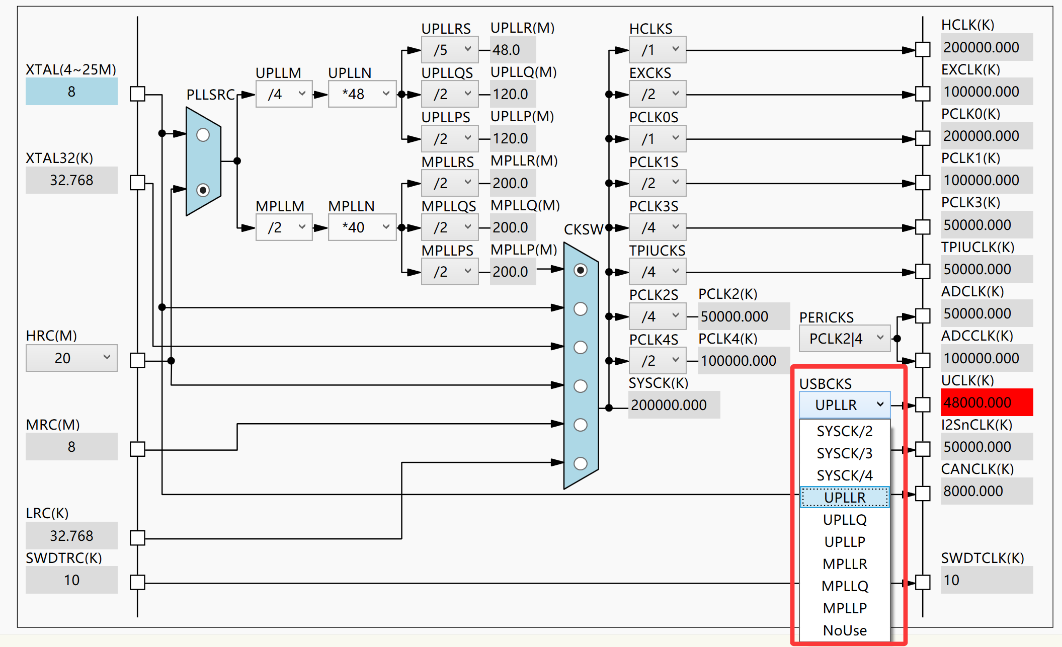 在使用HC32官方的代码生成工具XHCode的时候发现一个小问题:虽然在时钟树界面配置了USB的时钟,但是生成的代码中并没有对USBCKS的初始化。同时翻看官方驱动库HC32F460_DDL_Rev3.3.0中的例程时,发现并没有USB的例程。所以稍微研究了一下各个外设的时钟源,以及如何选择各时钟源,写篇文章记录一下。