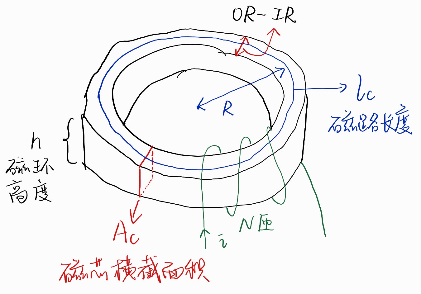 定义磁环的有效横截面积为Ac,内径为R,有效磁路长度为lc,磁导率为μc(下标c指core)。当R很大且内外径相近时,可以近似认为lc就是内圈圆环的周长,即lc=2πR。