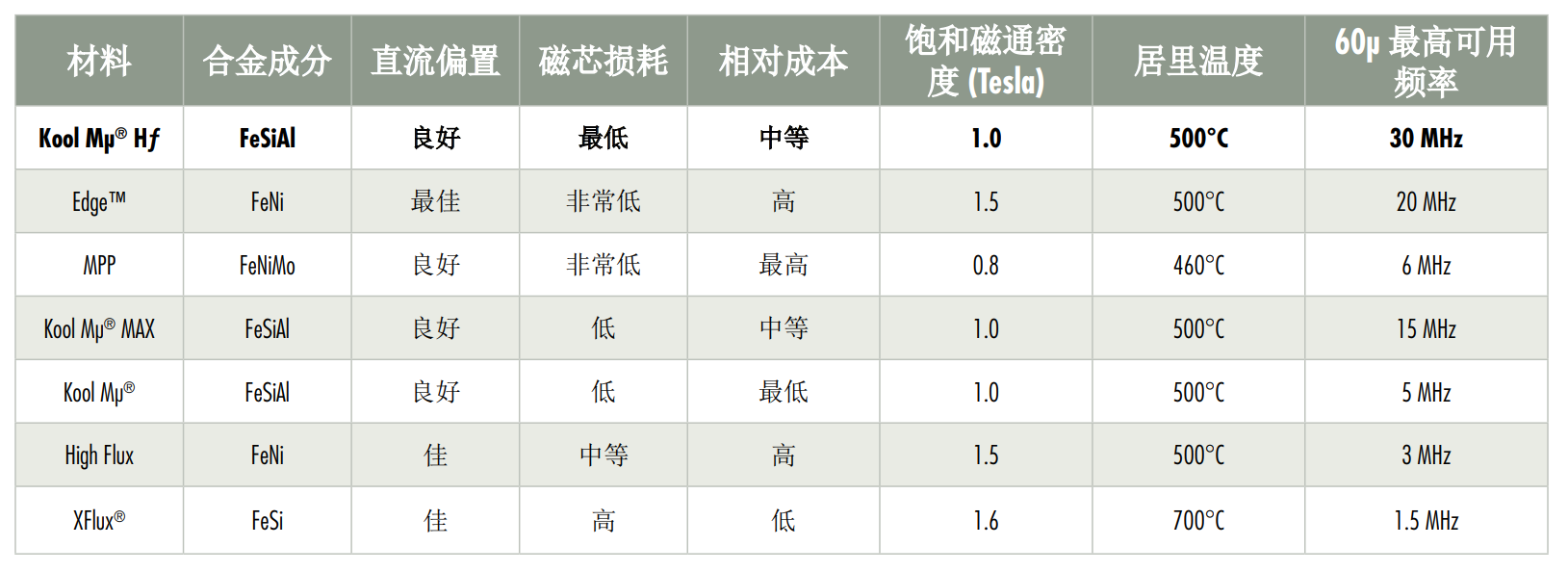 美磁官方的表格,给出了铁硅铝(FeSiAl)和铁镍(FeNi)磁环的饱和磁通密度Bsat