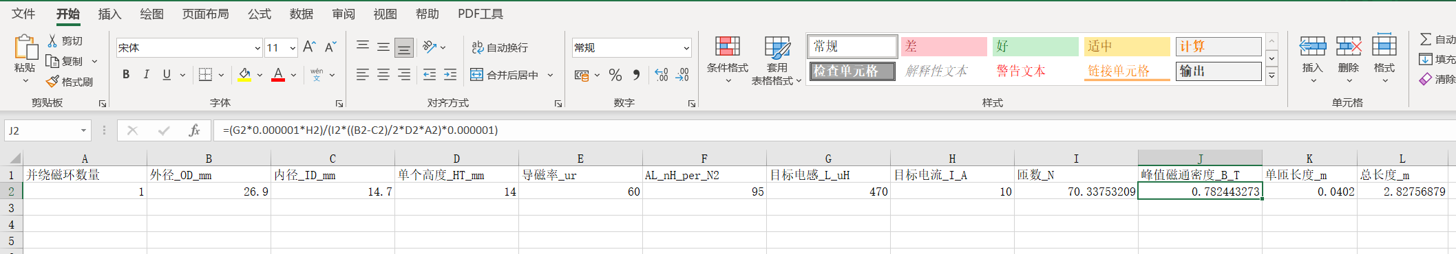 但是使用上面的公式来计算Bmax似乎有些麻烦了,要手动计算有效磁路长度l的大小。这里可以使用电感的电流型方程-式(1.3.4)来简化计算: